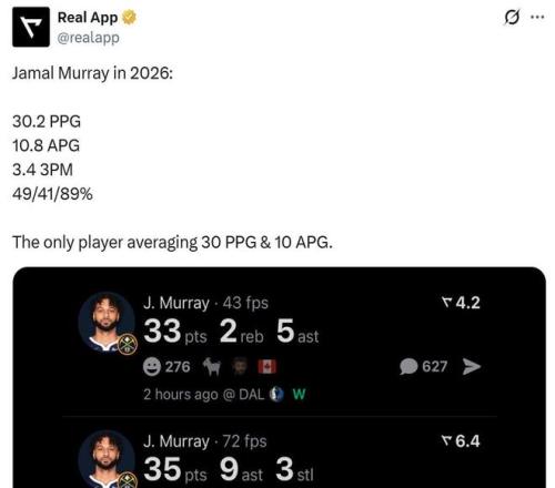 这样一来,在26年至今约基奇缺席的情况下,穆雷场均轰下30.2分10.8助攻,能够命中3.4记三分,三项命中率为49/41/89%,是26年以来联盟唯一能够做到场均至少30分10助攻的球员。