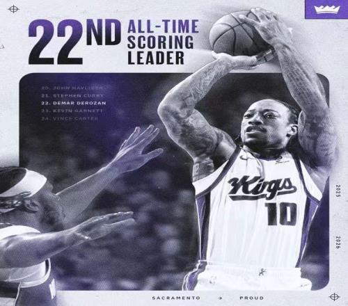德罗赞NBA生涯常规赛总分超越加内特26071分,升至NBA历史得分榜第22位迎来里程碑。