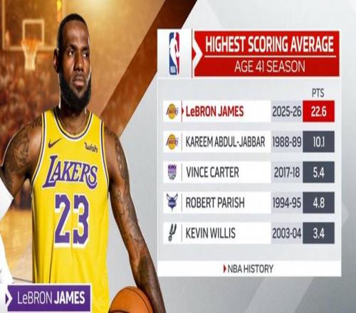 第2、转播方数据显示,41岁球员场均分对比:詹姆斯22.6分排名历史第1,天勾贾巴尔以10.1分排名第2,名宿文斯卡特5.4分名列第3。