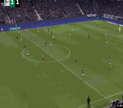 仅仅2分钟后,不莱梅中后场左侧斜长传快速反击,斯赫米德中路跟进突入禁区获得单刀机会,稍微慢半拍的情况下,面对出击的门将考阿,斯赫米德转身往右边做球,后排插上的米洛舍维奇迎球推射空门得手,不莱梅3:2反超了比分。从两度领先到落后,法兰克福没有放弃,补时最后1分钟,法兰克福右路压上,埃奇古亚卜强行突破下底,抢在皮球出底线之前将球兜回来,克瑙夫小禁区前沿抢点凌空推射,皮球直入球门右下死角,法兰克福3:3压哨绝平不莱梅。